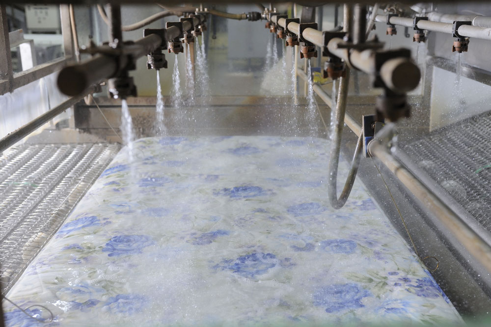 ふとん一枚におよそ200~300リットルの水を使用し、国内最大級の約20mの巨大ベルトコンベアー式自動前処理機でゆったりとふとんを広げた状態で、中わたまでキチンと洗剤を浸透させ、汚れを浮き立たせます。