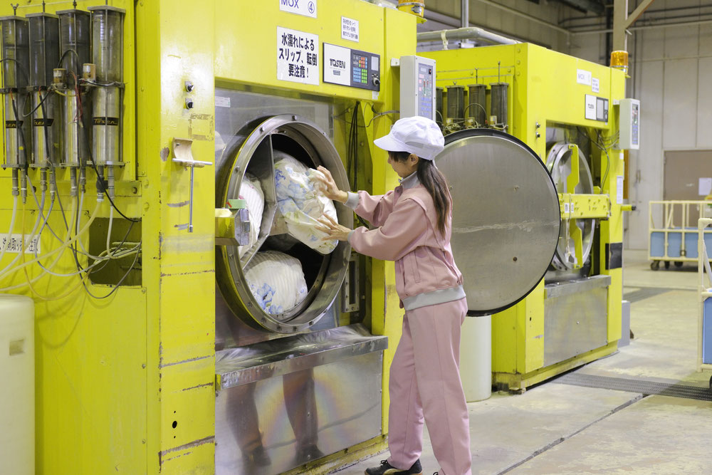 大型の洗濯機にふとんを入れ、水を使って中わたまでしっかり洗ってすすぎます。一枚のふとんに換算して、200~300リットルの水を使用します。羽毛ふとん・羊毛ふとん・綿ふとんや毛布・コタツふとんなど種類によって傷みや縮みが発生しないように使用する機械を変え、風合いを損なわず中わたの汚れを落とします。
