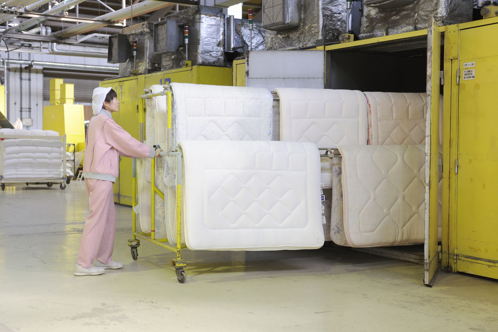 国内最大級の敷き布団専用乾燥機による予備乾燥+20室のブースを布団の種類で使い分ける本乾燥でふんわり仕上げ。低めの温度からじっくり乾燥するのがポイント!一気に高温で乾燥すると生地を傷めたり縮みの原因になり形が崩れてしまいます。
