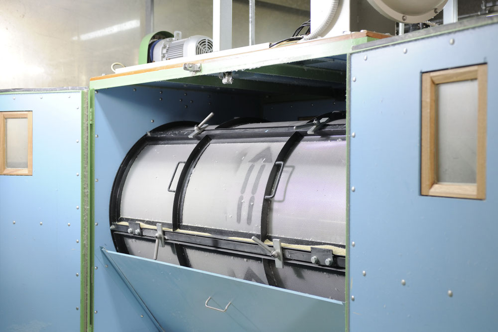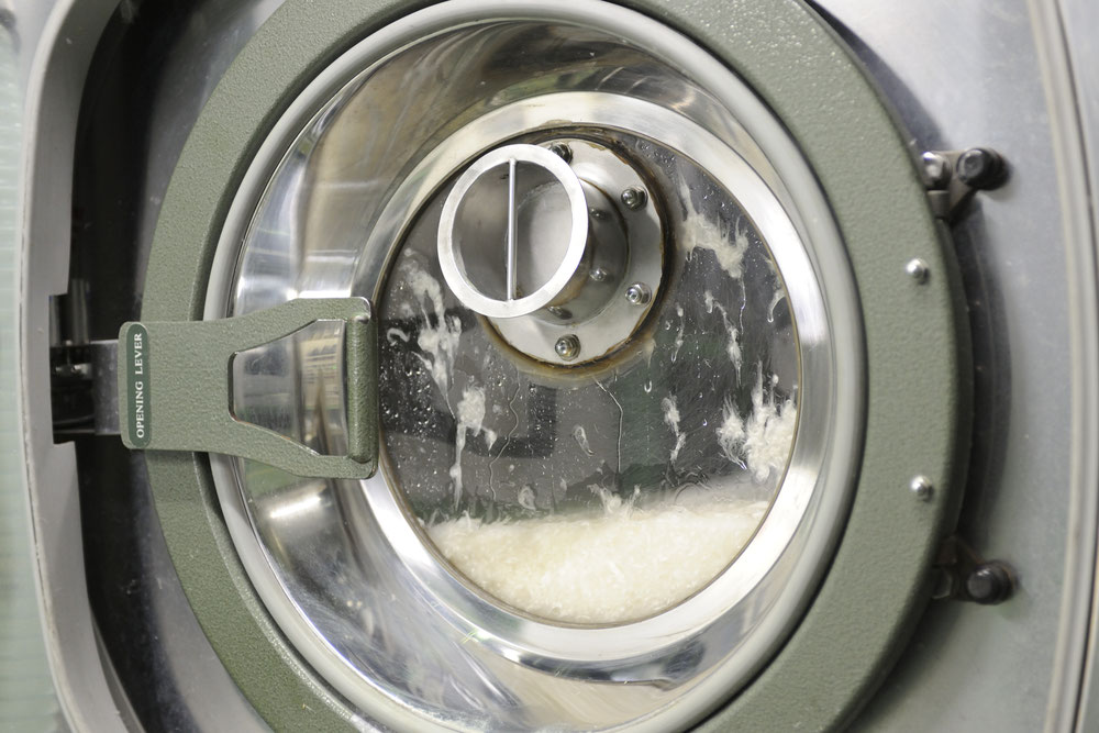 1枚分ずつの羽毛を洗浄機に投入し、専用洗剤で直接洗浄し、脱水・乾燥します。洗浄前は羽毛が絡んでタマ状になっていますが、洗浄後には、しっかりほぐれてふわっとなります。