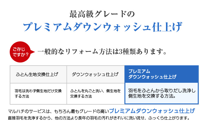 どんなに品質の良い羽毛ふとんでも長年使用すると羽毛のかたよりや吹き出しがおこり、本来の暖かさが損なわれてしまいます。大切なふとんだから捨てられず押入れの奥で眠っている・・・そんな経験をお持ちの方も少なくないのではないでしょうか。