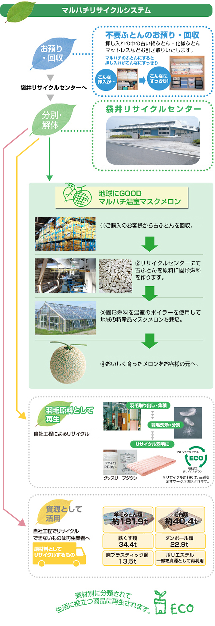 丸八グル―プでは2011年からお客様の不要になった古ふとんを固形燃料化し、メロン温室のボイラー燃料として再利用しています。かつては焼却処分していたふとんやベッド等をこうして固形燃料化することで、リサイクル率も大きく向上しています。